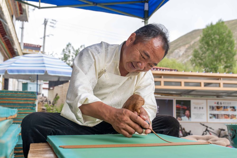 這是一名傳承西藏傳統(tǒng)雕刻修復技藝的雕刻師(8月6日攝)。西藏傳統(tǒng)雕刻修復技藝入選西藏自治區(qū)級非物質(zhì)文化遺產(chǎn)代表性項目名錄。