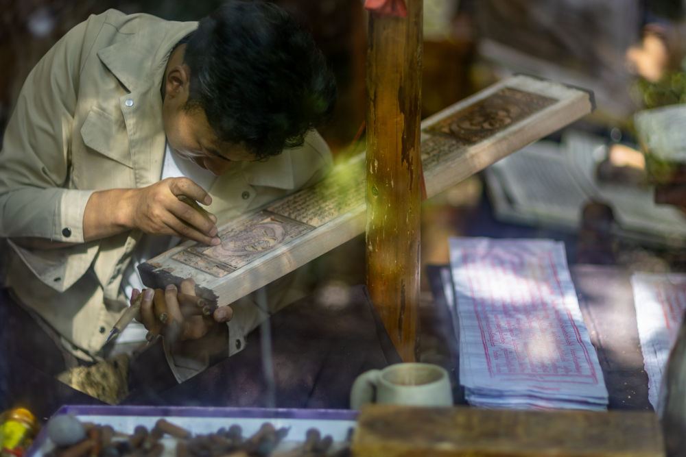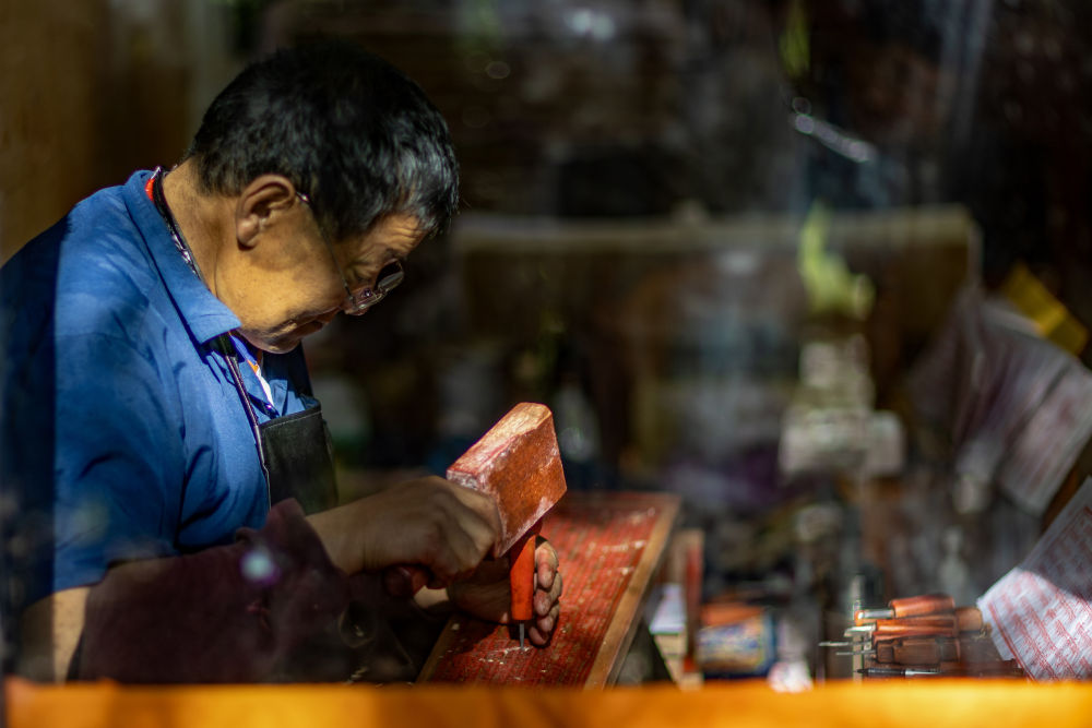 8月6日,一名雕刻師在工作中。西藏雪巴康雕版印刷制作技藝入選西藏自治區(qū)級非物質(zhì)文化遺產(chǎn)代表性項目名錄。