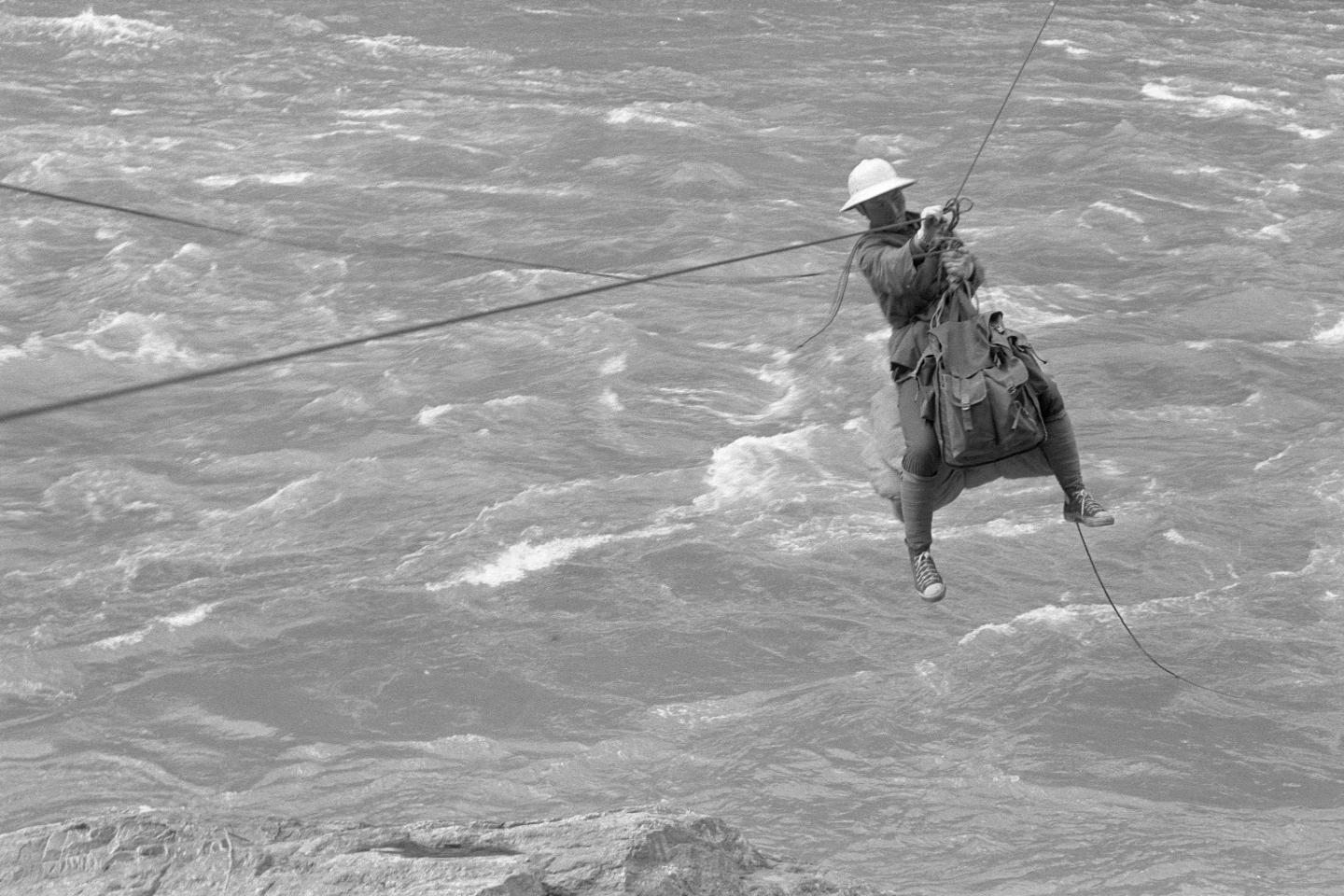 1983年,西藏林業(yè)局考察隊(duì)員通過雅魯藏布江上的溜索過江。新華社記者 土登 攝