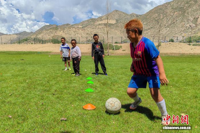 圖為8月12日,一群雙湖搬遷而來(lái)的兒童在森布日安置點(diǎn)一處草地上練習(xí)足球。江飛波 攝