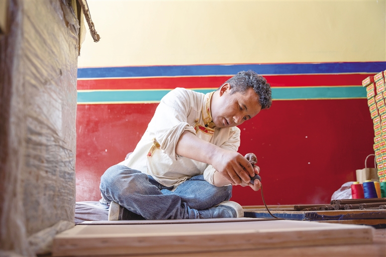 8月13日,記者來到尼木縣普松鄉(xiāng)曲水村的一個(gè)院落,58歲的斯曲正在窗邊埋頭雕刻,刻刀飛轉(zhuǎn)游走間,精致的花紋在木板上慢慢展現(xiàn),很快雕刻作品便初具雛形。作為普松雕刻第六代傳承人,斯曲自12歲起就在爺爺和爸爸的教導(dǎo)下開始學(xué)習(xí)這門手藝,如今的他早已成為普松雕刻自治區(qū)級(jí)非物質(zhì)文化遺產(chǎn)代表性傳承人。斯曲介紹,普松雕刻步驟煩瑣、工具講究,根據(jù)圖案復(fù)雜程度不同,耗時(shí)從6小時(shí)到3個(gè)月不等,十分考驗(yàn)雕刻者的耐心。