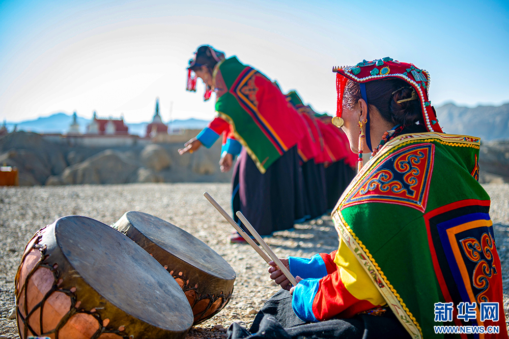 自治區(qū)級(jí)“宣舞”非遺傳承人央金(右)在古格王國(guó)遺址腳下伴奏鼓樂(6月12日攝)。新華網(wǎng) 旦增努布 攝