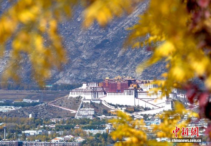 10月20日,西藏拉薩深秋如畫。圖為拉薩天堂草原自然風(fēng)景區(qū)的黃葉與布達拉宮相映成趣。中新社記者 李林 攝