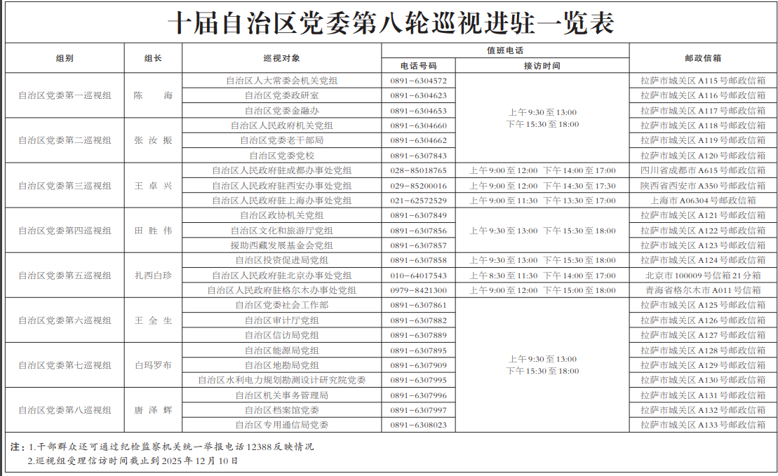 根據(jù)自治區(qū)黨委關(guān)于巡視工作的統(tǒng)一部署,截至10月24日,十屆自治區(qū)黨委第八輪巡視完成進(jìn)駐工作。自治區(qū)黨委巡視組將對(duì)自治區(qū)人大常委會(huì)機(jī)關(guān)、政府機(jī)關(guān)、政協(xié)機(jī)關(guān),自治區(qū)黨委社會(huì)工作部、政研室、金融辦、老干部局、機(jī)關(guān)事務(wù)管理局、黨校,自治區(qū)審計(jì)廳、信訪局、能源局、投資促進(jìn)局、地勘局、檔案館、專用通信局、水利電力規(guī)劃勘測設(shè)計(jì)研究院,自治區(qū)人民政府駐北京辦事處、駐成都辦事處、駐西安辦事處、駐上海辦事處、駐格爾木辦事處,援助西藏發(fā)展基金會(huì)等23個(gè)區(qū)直單位黨組織開展常規(guī)巡視;對(duì)自治區(qū)文化和旅游廳黨組開展巡視“回頭看”。