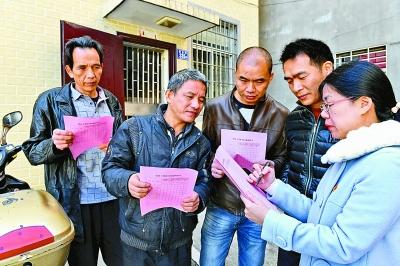 福建省福清市宏路街道紀(jì)檢干部(右一)在新倉(cāng)村向村民分發(fā)黨員干部作風(fēng)問卷調(diào)查表。新華社記者 張國(guó)俊攝
