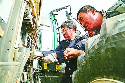 春季備耕時節(jié),山東省濱州市沾化區(qū)農(nóng)機部門組織“黨員農(nóng)機服務(wù)隊”到田間地頭為群眾服務(wù)。圖為3月27日,該區(qū)“黨員農(nóng)機服務(wù)隊”成員李成林(左一)在為群眾搶修拖拉機。賈海寧攝/光明圖片