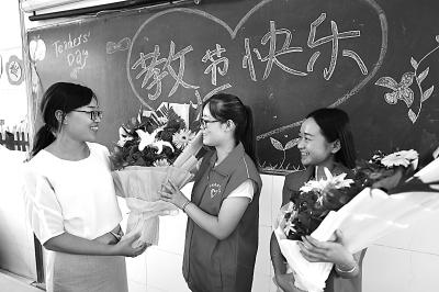 教師節(jié),學生們向老師獻花致敬。資料圖片
