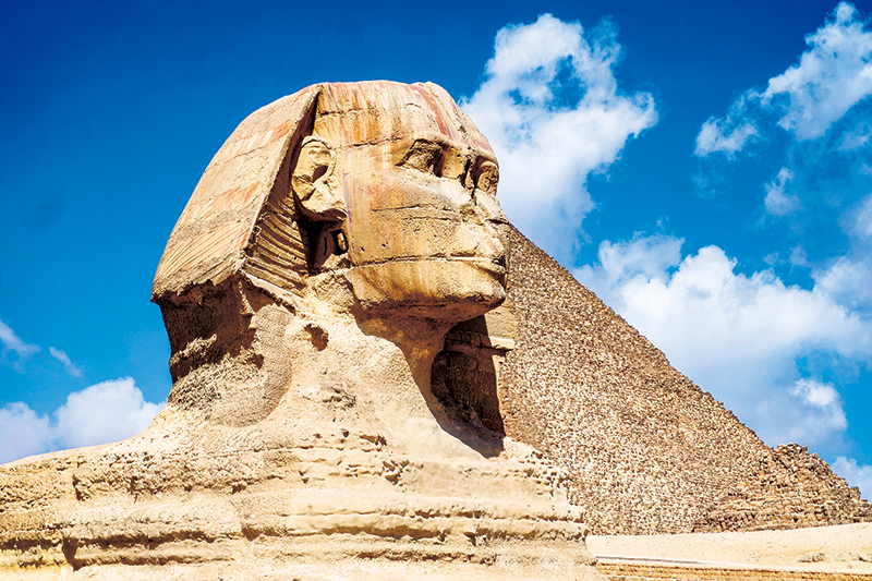 斯芬克司(獅身人面像)位于埃及哈夫拉金字塔附近,長約57米,高約20米,據(jù)說由一塊巨石雕成,象征法老威嚴,是古埃及文明最有代表性的遺跡之一。圖為古埃及斯芬克司。