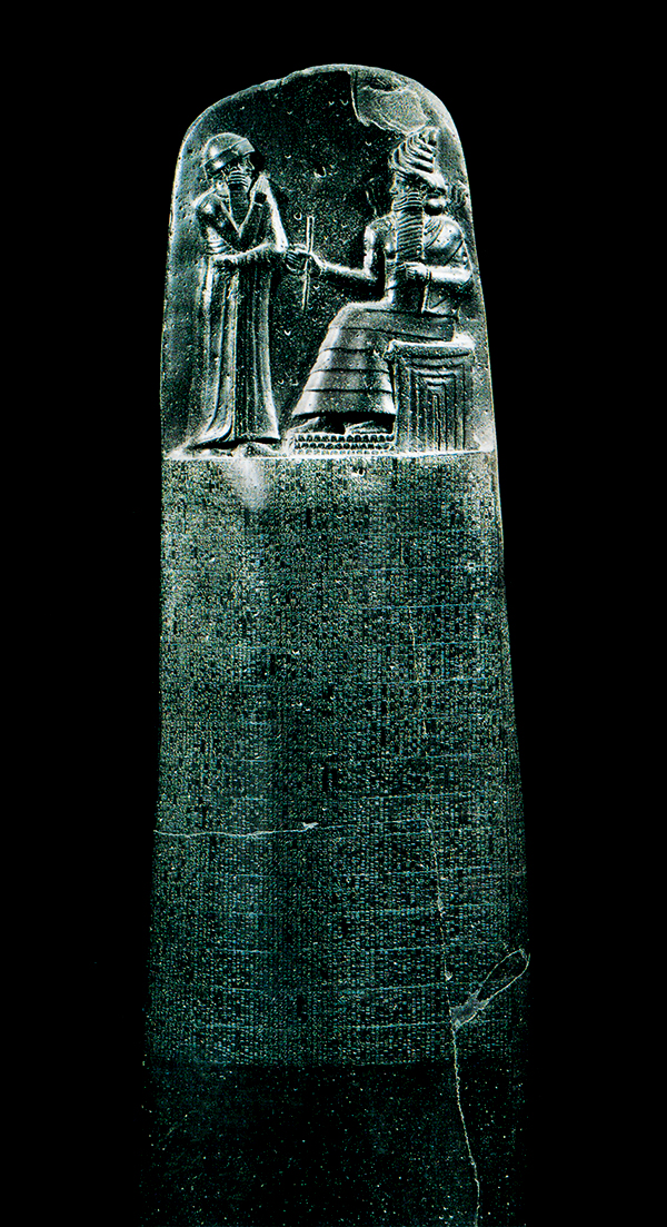 《漢穆拉比法典》是古代兩河流域文明的象征。這座在公元前18世紀建造的玄武巖石碑,上端有漢穆拉比從太陽神沙馬什手中接受權杖的浮雕像,下面用楔形文字銘刻法典全文。法典除序言和結語外,計有3500行、282條,包括訴訟手續(xù),財產(chǎn)權,損害賠償,租佃關系,債權債務,婚姻家庭,繼承以及買賣奴隸等內(nèi)容,是迄今世界上完整保存下來的最早的一部法典。圖為現(xiàn)藏于法國巴黎盧浮宮的《漢穆拉比法典》。