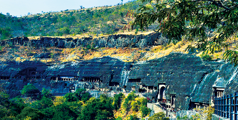 印度阿旃陀石窟鑿于一處馬蹄形暗色巖陡崖上,其形成年代主要分為兩個時期:公元前2世紀至公元前1世紀和公元5至6世紀。它集古代建筑、雕刻、繪畫之大成,融佛教信仰、文化變遷、社會生活于一體,既具有極高的藝術價值,又飽含深厚的歷史底蘊。圖為在印度馬哈拉施特拉邦拍攝的阿旃陀石窟外景。 新華社記者 張迺杰/攝