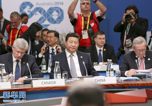2014年11月15日,二十國集團領(lǐng)導人第九次峰會在澳大利亞布里斯班舉行。國家主席習近平出席會議并發(fā)表題為《推動創(chuàng)新發(fā)展 實現(xiàn)聯(lián)動增長》的重要講話。新華社發(fā)