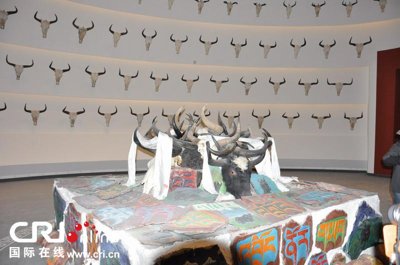 西藏牦牛博物館一共分四個廳:感恩牦牛、探秘牦牛、相伴牦牛、靈美牦牛。十世班禪大師生前說過:“沒有牦牛就沒有藏族”,深刻地揭示了牦牛與藏族密不可分的關(guān)系。感恩牦牛展廳運用轉(zhuǎn)經(jīng)筒、牦牛頭骨、瑪尼堆、場景畫、壁畫等形式,表達了藏族人民對牦牛的感恩和崇敬。圖為感恩牦牛展廳中的展品--自然死亡的野牦牛頭部。圖片來源:國際在線