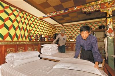 圖為阿里地區(qū)札達(dá)縣托林鎮(zhèn)群眾正在自己的家庭旅館中收拾床鋪。次旺 唐斌 攝