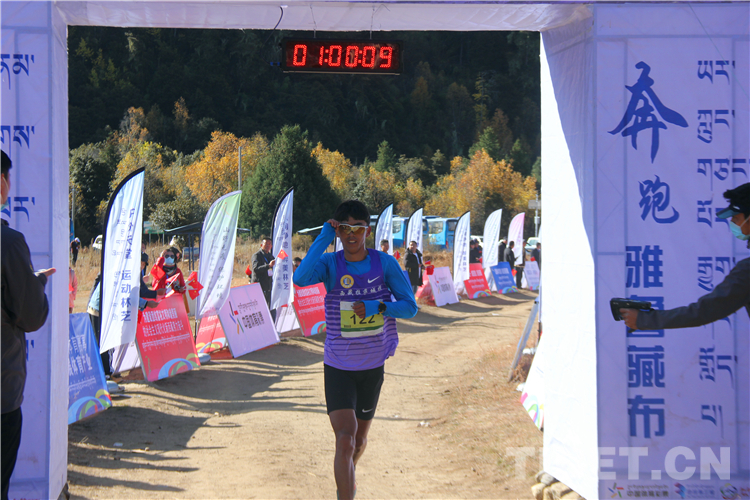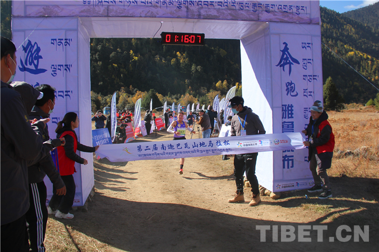 在雪山的映襯下,參賽選手們身穿各色服裝,伴隨著周邊村民的加油助威,一路抵達(dá)終點(diǎn)。最終,來(lái)自西藏自治區(qū)山南市的扎巴以59分02秒的成績(jī)獲得男子組第一名,邊片以1小時(shí)16分12秒的成績(jī)奪得女子組第一名。