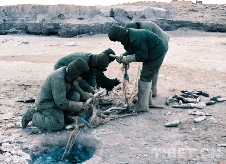 這是冬季在藏北無(wú)人區(qū)扎加藏布的破冰打魚人(唐召明1990年初攝)
