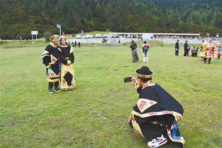 圖為來自廣東的游客在魯朗身著工布服飾拍照留念。 本報(bào)記者 張猛 攝