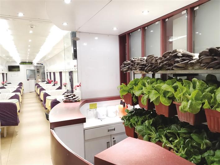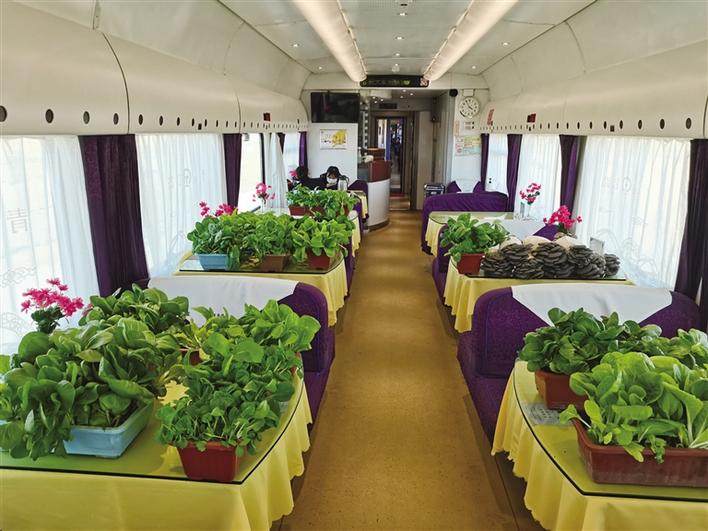 車窗外草原蒼茫,雪山巍峨,車廂里綠意盎然,一盆盆新鮮蔬菜隨著列車,一路西行,自由生長,旅客們吃著原汁原味的“泥土菜”,一路歡歌,一路美景到拉薩。(圖由青藏鐵路集團有限公司提供)