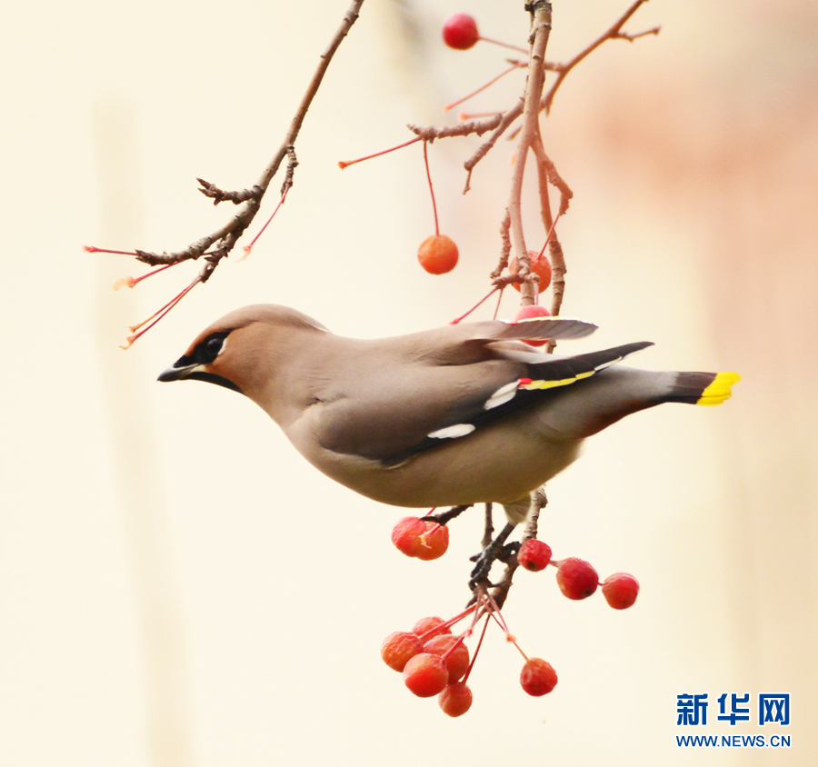 一只太平鳥正銜著一顆海棠果。新華網(wǎng)發(fā)(李崇軒攝)