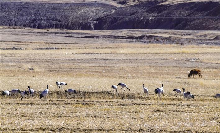遠(yuǎn)遠(yuǎn)望去,只見高頸長腿的黑頸鶴一邊覓食、一邊梳理羽毛,悠然自得。如果耐心一點在田間蹲守,不時還可以看到成群的黑頸鶴飛翔于冬日的藍(lán)天下,姿態(tài)優(yōu)美地盤旋,尋找合適的田間落下。旦增說,它們要覓食至傍晚時分,才成群結(jié)隊飛回虎頭山水庫。