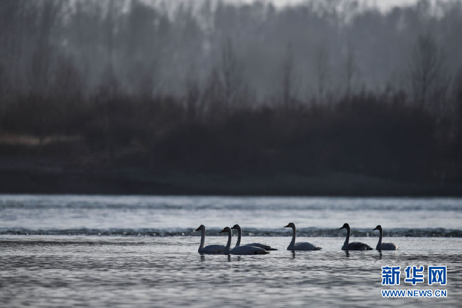 12月11日,幾只大天鵝在青海省貴德縣境內(nèi)的黃河里游弋。新華社記者 吳剛 攝