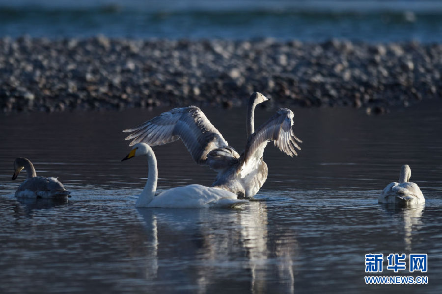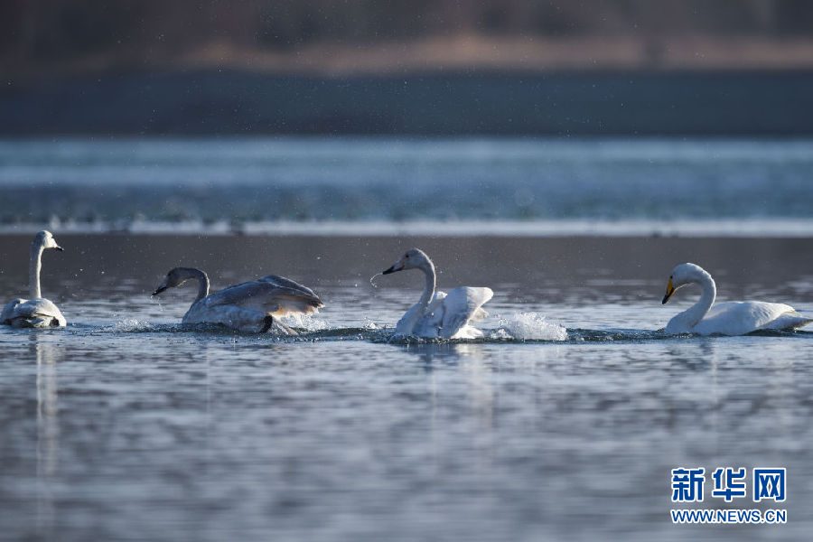 12月11日,幾只大天鵝在青海省貴德縣境內(nèi)的黃河里嬉戲。新華社記者 吳剛 攝
