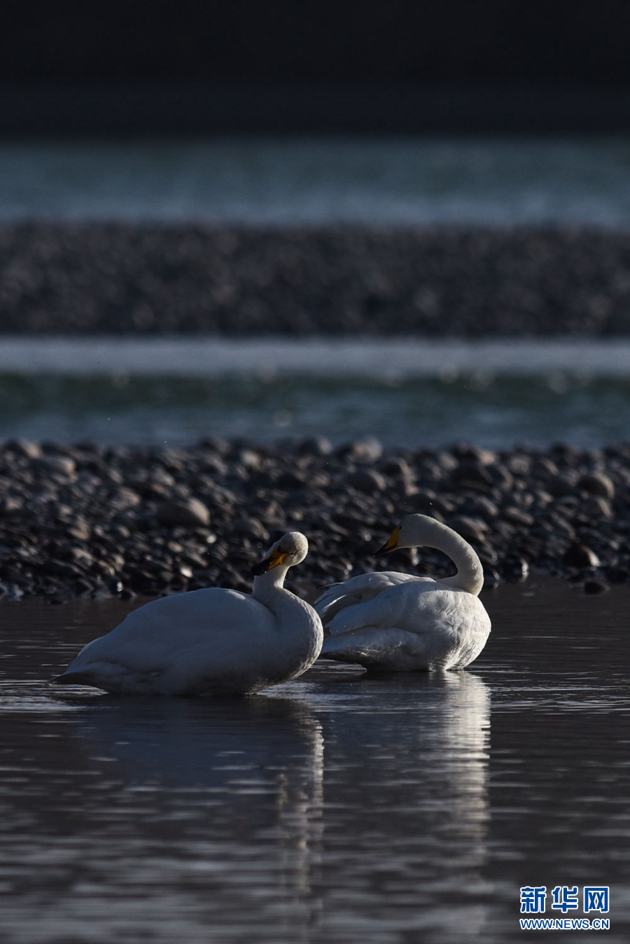 12月11日,兩只大天鵝在青海省貴德縣境內(nèi)的黃河里游弋。新華社記者 吳剛 攝