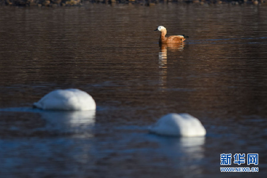 12月11日,一只赤麻鴨與大天鵝在青海省貴德縣境內(nèi)的黃河里游弋。新華社記者 吳剛 攝