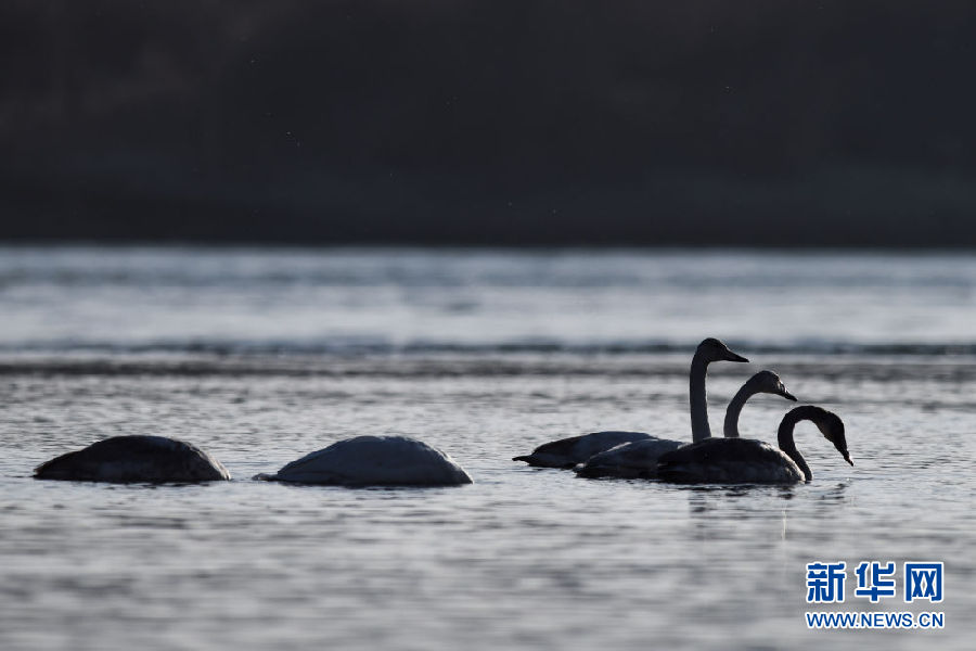 12月11日,幾只大天鵝在青海省貴德縣境內(nèi)的黃河里覓食。新華社記者 吳剛 攝