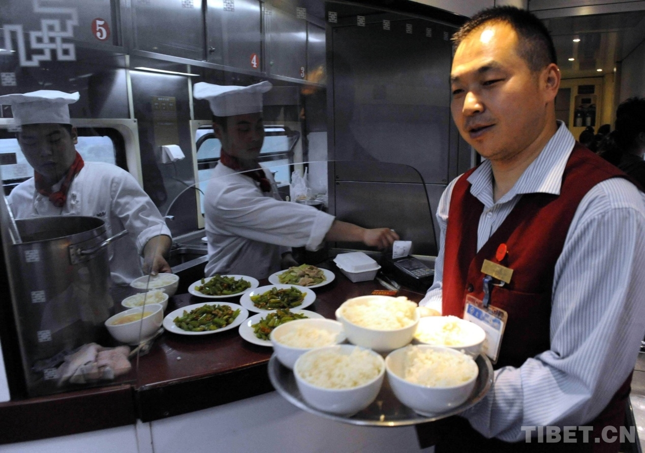 這是京藏車隊(duì)三組餐車主任、優(yōu)秀共產(chǎn)黨員馮順義在唐古拉山區(qū)段為旅客供應(yīng)午餐(唐召明2010年7月4日攝)