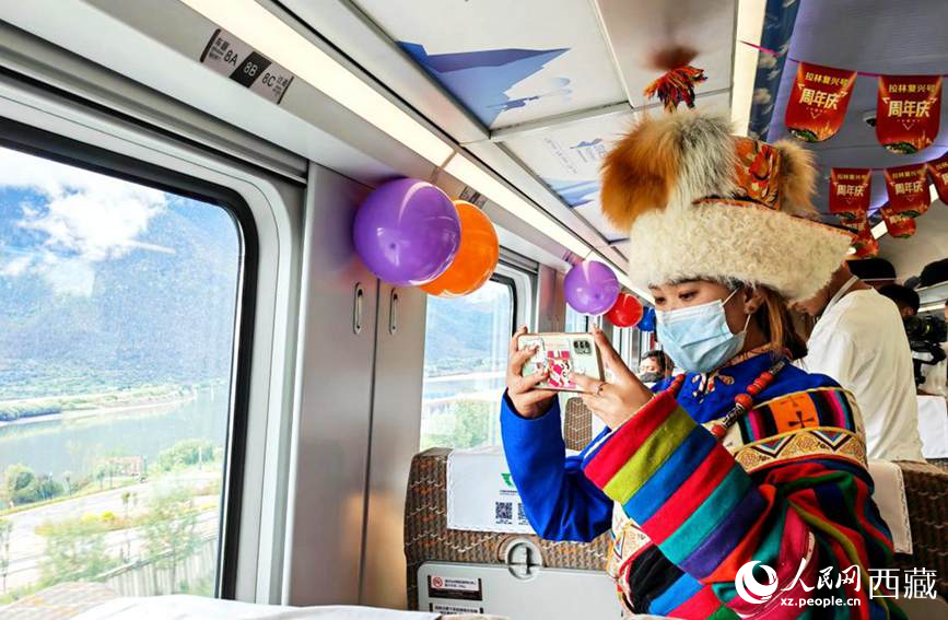 拉林鐵路開(kāi)通一周年,旅客祝拉林鐵路生日快樂(lè)。人民網(wǎng) 李海霞攝