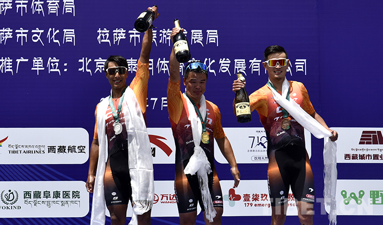 圖為7月23日,2022環(huán)拉薩城自行車大賽公路自行車男子精英組前三名侯棟乙(中)、胡志超(左)、孫小龍(右)在頒獎(jiǎng)儀式上慶祝 攝影:王媛媛