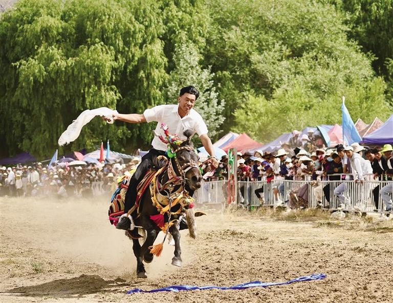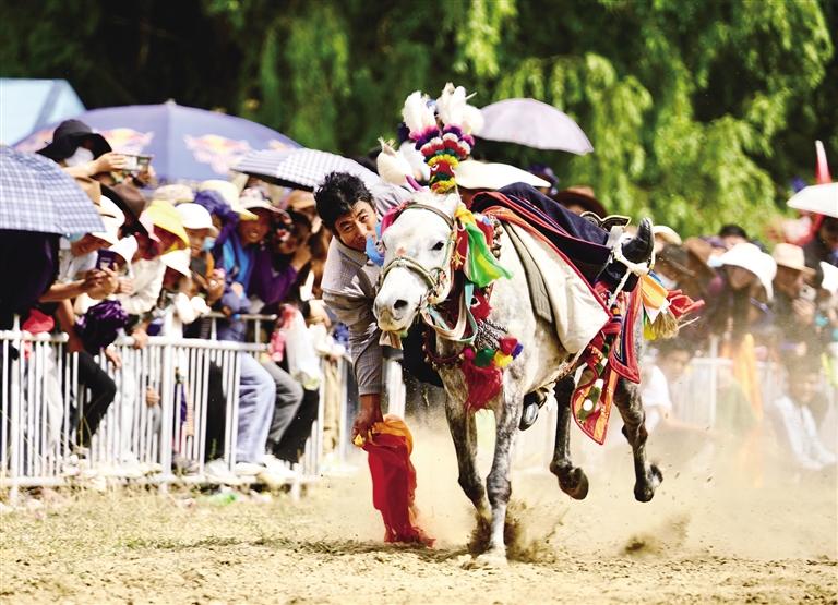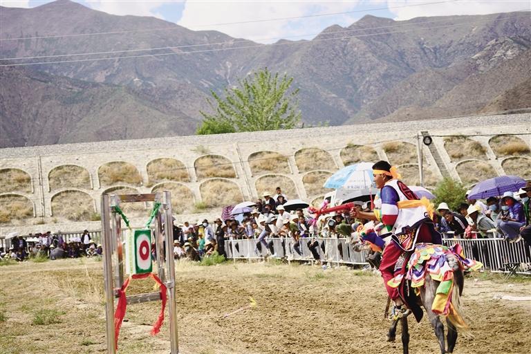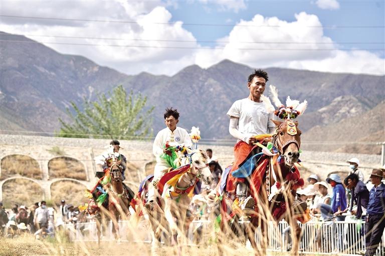 當(dāng)日上午11時(shí),茶巴朗村望果節(jié)賽馬正式開始,騎手們身著傳統(tǒng)服飾,戴著紅纓帽,身背彎弓,騎著打扮華麗的駿馬,進(jìn)行了4000米速度賽馬、拾哈達(dá)、射箭、馬術(shù)等精彩比賽?,F(xiàn)場(chǎng),觀眾揮舞手臂為選手們鼓勁吶喊。馳騁在賽場(chǎng)上,選手的吆喝聲伴著觀眾的吶喊聲在賽場(chǎng)上空匯聚。