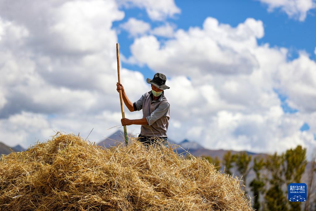 9月21日,拉薩市林周縣邊林鄉(xiāng)當(dāng)杰村的村民在收集秸稈。新華社記者 姜帆 攝