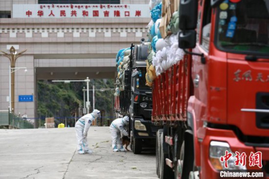 吉隆出入境邊防檢查站移民管理警察對外出口岸限定區(qū)域車輛進行消毒?!⌒じ毁F 攝
