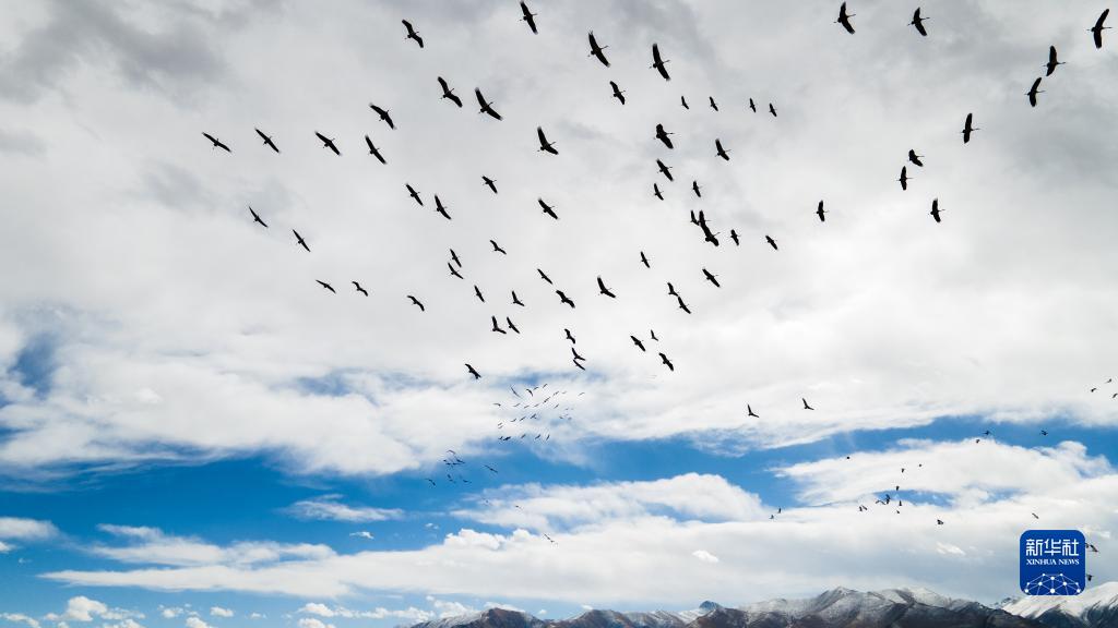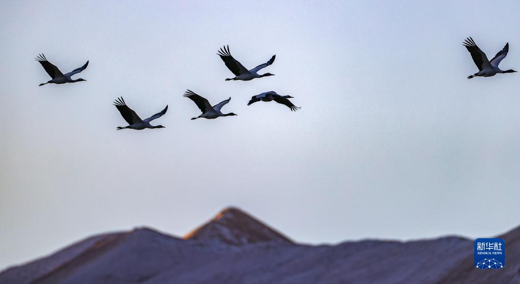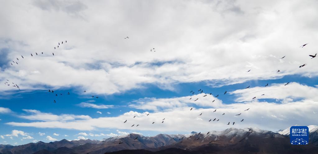 黑頸鶴群飛過(guò)林周縣強(qiáng)嘎鄉(xiāng)境內(nèi)山梁(11月6日攝)。新華社記者 姜帆 攝