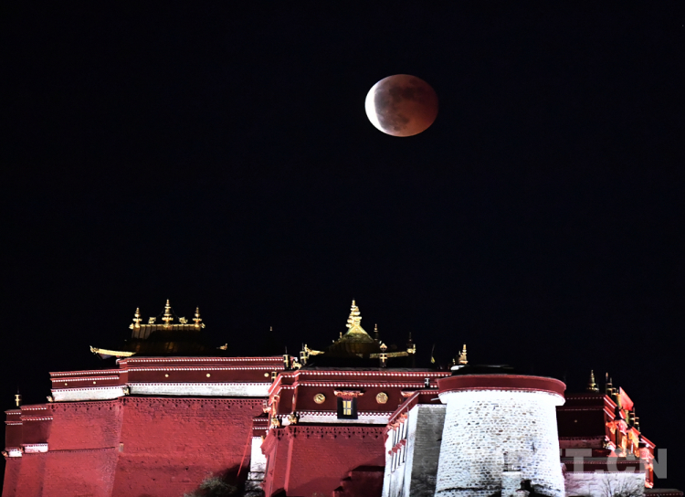 中國(guó)西藏網(wǎng)訊 11月8日晚,天宇上演精彩月全食,我國(guó)絕大部分地區(qū)都可以看到全食的“紅月亮”階段。圖為拉薩上空的“紅月亮” 攝影:覺(jué)果