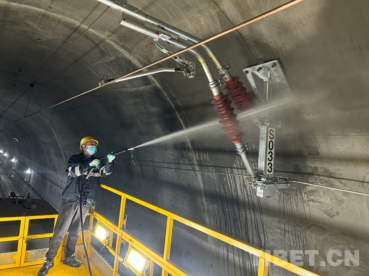 中國西藏網(wǎng)訊 初冬時節(jié),雅魯藏布江畔,秋葉繽紛、層林盡染。在穿山過江的拉林鐵路桑珠嶺隧道內(nèi)機器轟鳴、人聲鼎沸。11月14日10時25分,中國鐵路青藏集團有限公司拉薩基礎(chǔ)設(shè)施段桑日綜合維修車間的接觸網(wǎng)工陳世召頭戴安全帽、身穿防雨服、腳踩絕緣靴,手中的高壓水槍迸射出道道白色弧線。