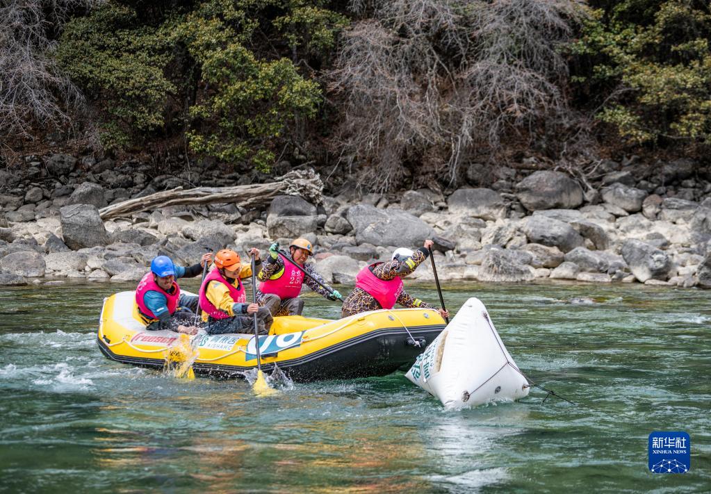 4月16日,在激流漂流筏繞標賽中,“星野新域漂流隊”選手向終點沖擊。他們最終獲得第十名。新華社記者 孫非 攝