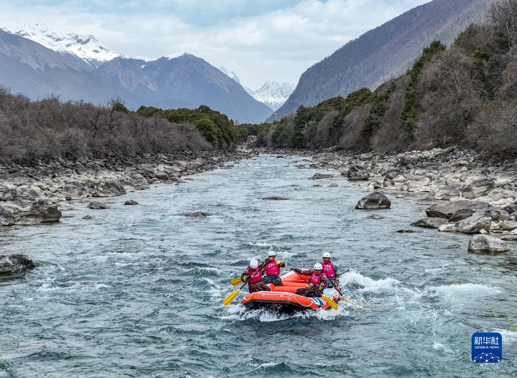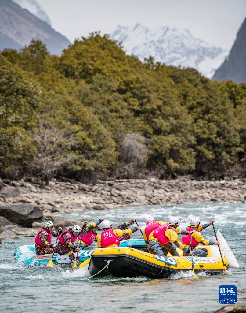4月16日,“西藏旅游股份有限公司漂流隊”選手在激流漂流筏繞標賽中,他們最終獲得季軍(無人機照片)。新華社記者 孫非 攝