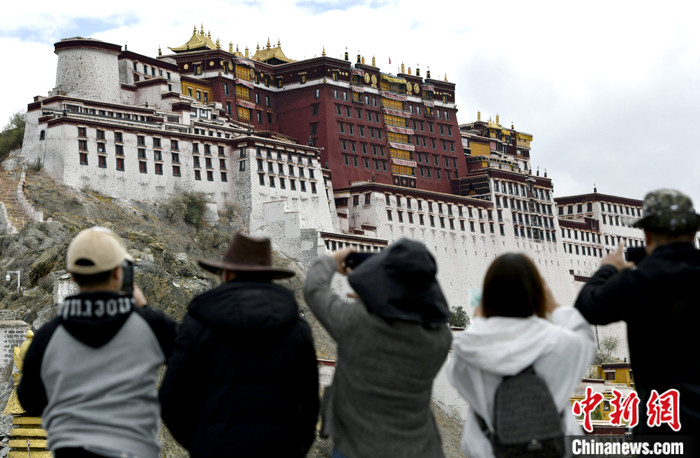 5月19日,游客在西藏拉薩布達(dá)拉宮觀景臺(tái)拍照留念。5月的拉薩初夏,草木漸茂、綠樹(shù)成蔭,雨量充沛、濕度適宜,日光充盈卻少了一絲燥熱,成為了眾多游客選擇進(jìn)藏的最佳時(shí)節(jié)。 中新社記者 李林 攝