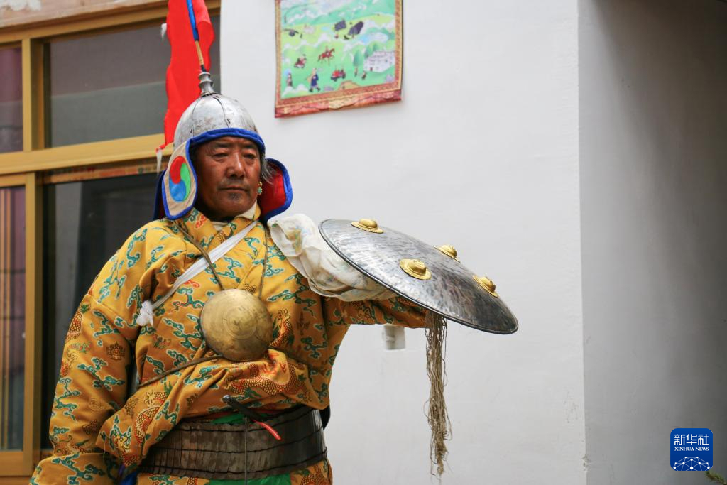 在赤德村,流傳于此的宮廷禮儀舞蹈“仲”舞,距今已有百年歷史,其中一幕是舞者頭頂青稞酒壺給客人敬酒,以體現(xiàn)崇高的迎客禮儀。在西德村,“果爾孜”舞的“將士們”身著盔甲、頭戴頭盔、手持劍盾,和著由慢漸快的鼓聲,贊美出征的將士、崇拜保家護(hù)國(guó)的兵器……