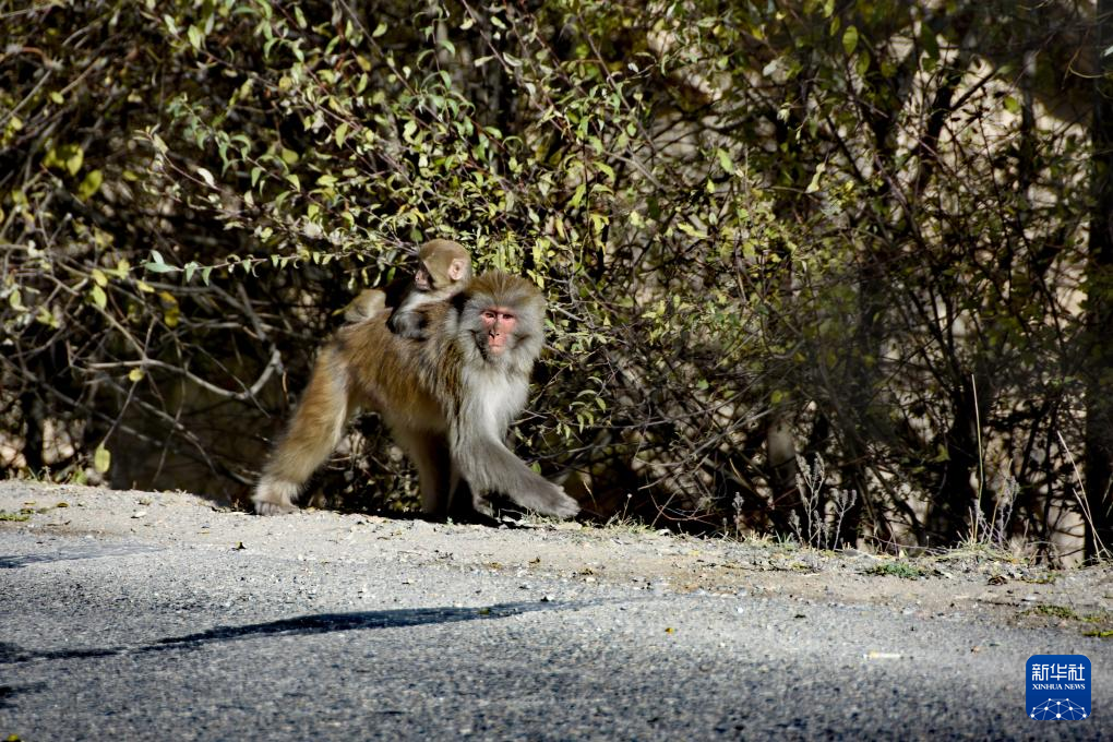 一只藏獼猴背著小猴子在公路旁行走(10月25日攝)。新華社記者 劉文博 攝 ??