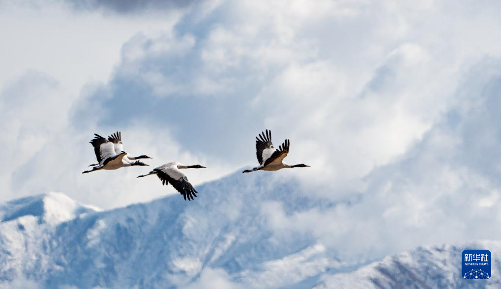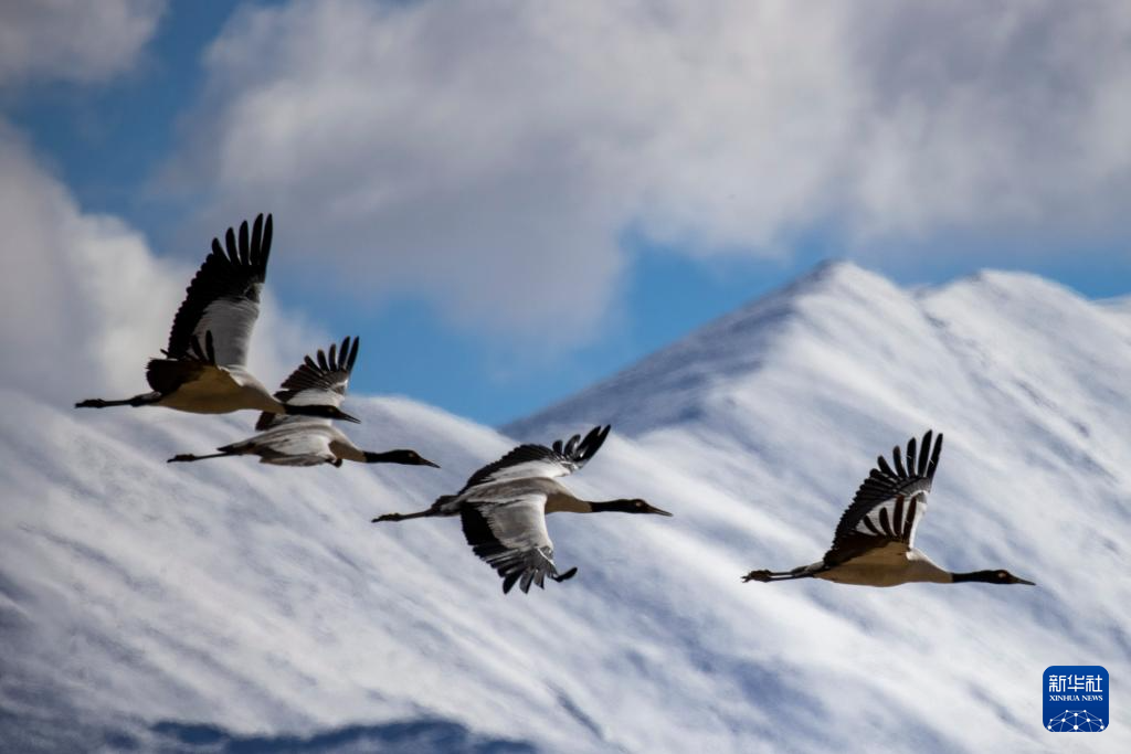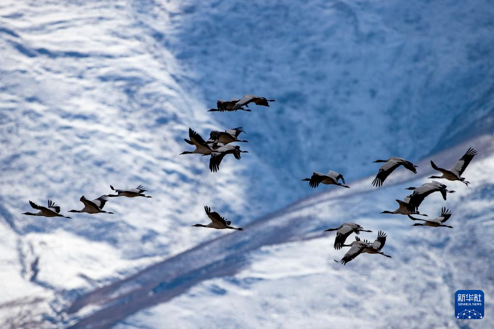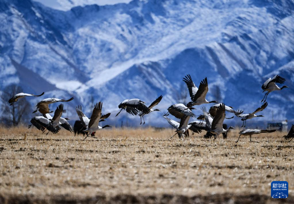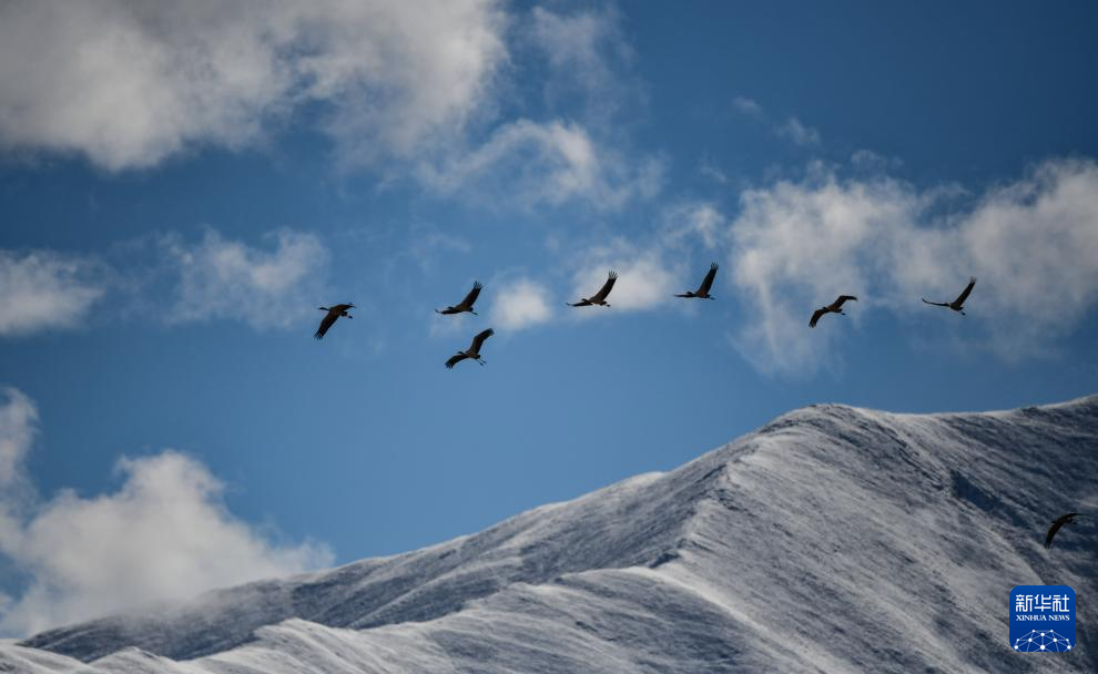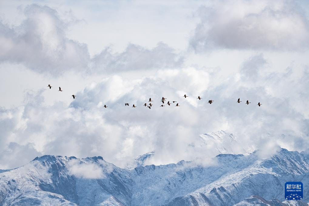 12月8日拍攝的拉薩市林周縣境內(nèi)雪山前飛翔的黑頸鶴。新華社發(fā)(丁增尼達(dá)攝)