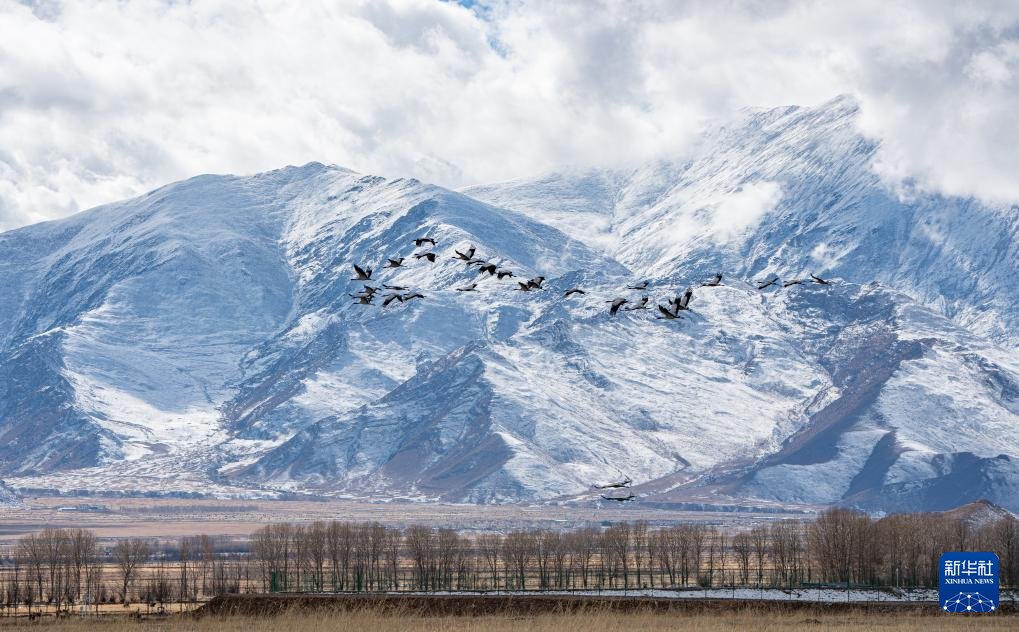 12月8日拍攝的拉薩市林周縣境內(nèi)雪山前飛翔的黑頸鶴。新華社記者 晉美多吉 攝