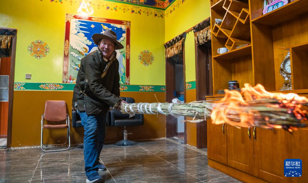 巴桑普尺的家人拿著火把舉行傳統(tǒng)儀式(1月10日攝)。新華社發(fā)(丁增尼達(dá) 攝) ??