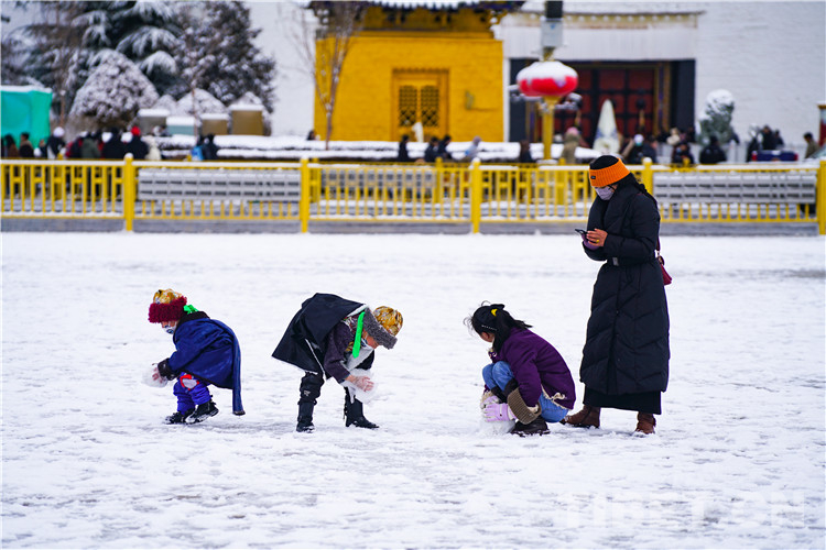 第四站,布達拉宮廣場。“給我一瓶礦泉水,我能還你兩座布達拉宮。”比起什么時候都可以在這里拍的布達拉宮倒影,雪中的布達拉宮廣場可謂是“可遇不可求”。南方的游客在這里激動地高喊“我終于見到雪了”,北方的游客抖抖肩膀上的雪花繼續(xù)拍攝下一組寫真,本地的藏族娃娃和小伙伴們一起追逐嬉戲,雪中的西藏和平解放紀念碑顯得更加巍峨。