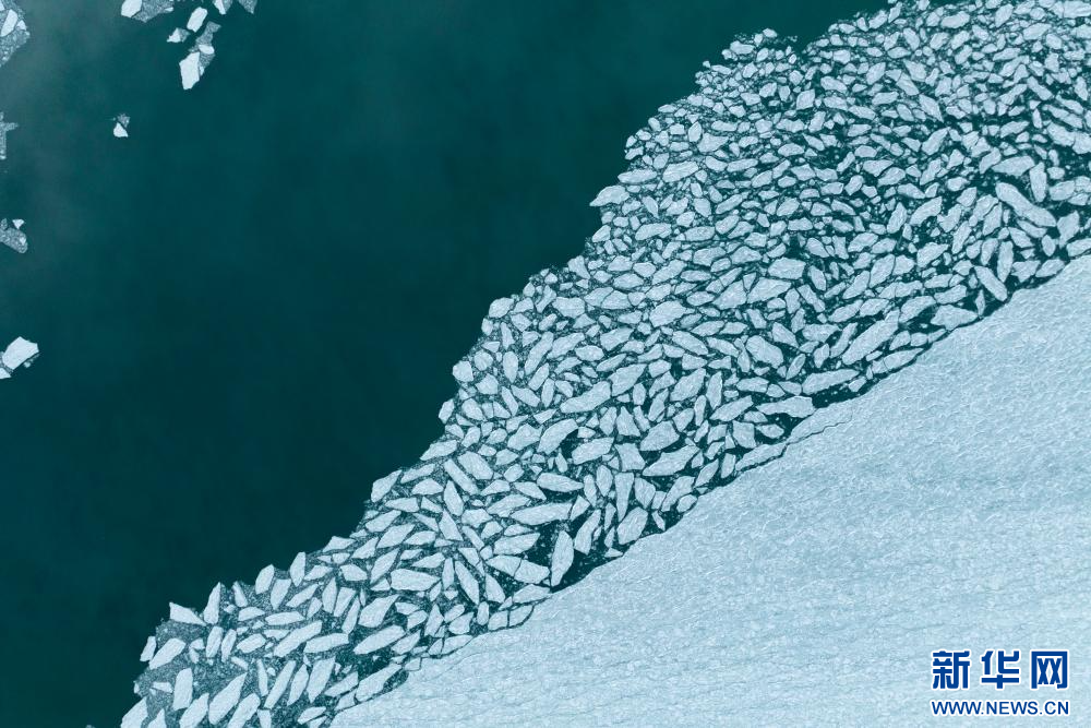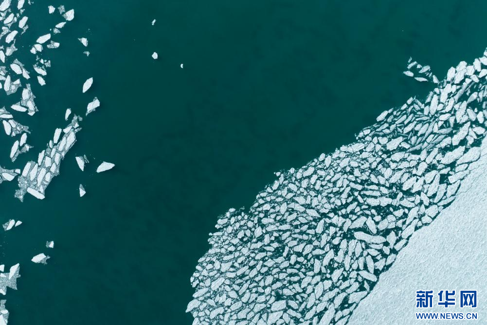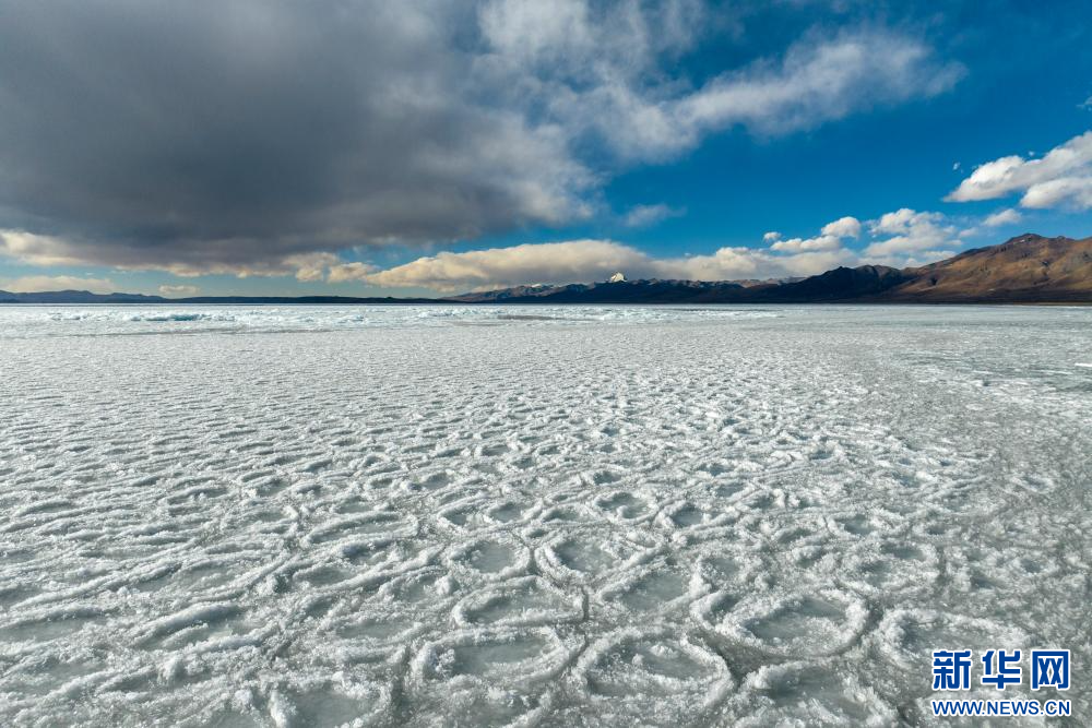1月29日拍攝的瑪旁雍錯湖面上的冰堆積在一起,呈現(xiàn)出各式各樣的造型(無人機(jī)照片)。新華網(wǎng) 旦增努布 攝