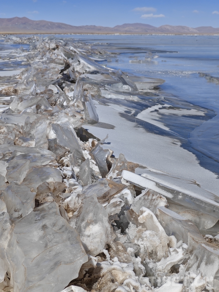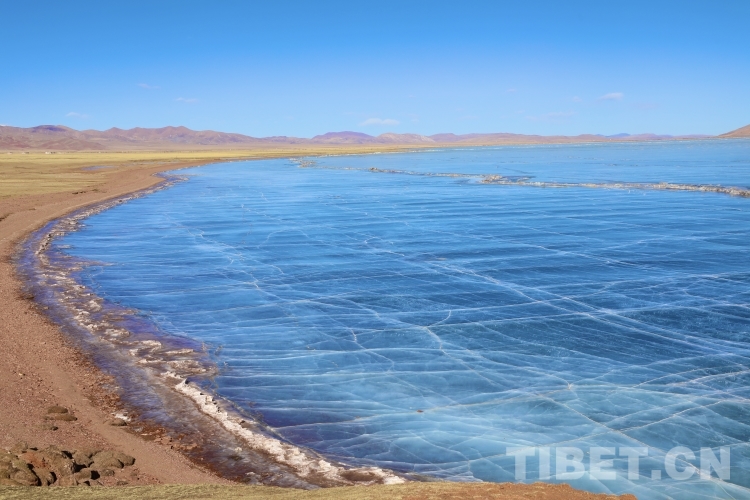 錯(cuò)那湖湖面海拔4600米左右,面積400多平方公里,是世界上海拔最高的淡水湖,更有冰泡、冰裂、冰推等奇妙的自然景觀。當(dāng)氣溫急劇下降時(shí),水溫也驟降,湖底產(chǎn)生的氣體在上升過(guò)程中被凍在冰中,形成許多細(xì)小的白色氣泡,懸浮在厚厚的冰層之中。湖水表面一層被藏北的朔風(fēng)快速凍結(jié)成冰,部分碎冰在岸邊堆積,形成隆起的“冰岸線”。又由于初春晝夜溫差較大,湖冰崩裂,形成網(wǎng)狀的冰裂紋路。這些透明裂紋從岸邊開(kāi)始,像潮水一樣漫過(guò)平地,漫過(guò)羌塘草原腹地,漫到天邊,把羌塘大地裝扮成一個(gè)冰晶縱橫交錯(cuò)的世界。(中國(guó)西藏網(wǎng)文/李一凡 張萌萌 龍真多吉)
