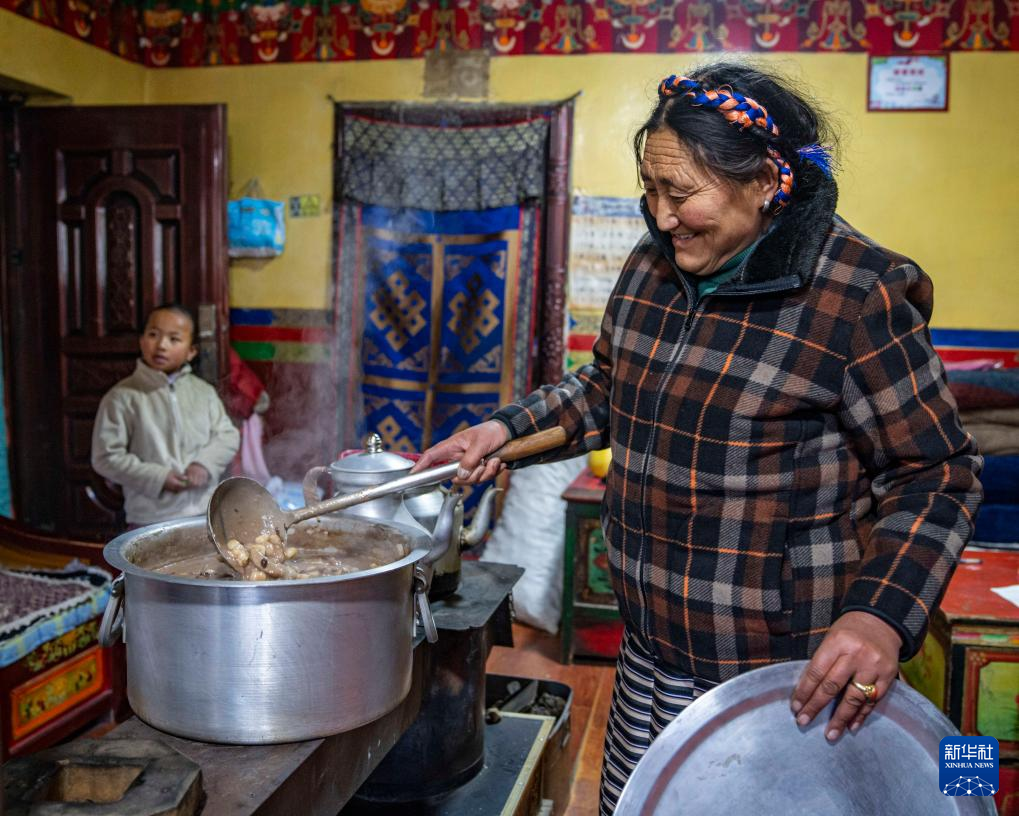 在位于西藏拉薩市當雄縣公塘鄉(xiāng)甲根村的家中,斯曲旺姆的兒子索朗羅達為母親端上“古突”(2月8日攝)。新華社記者 孫非 攝 ??