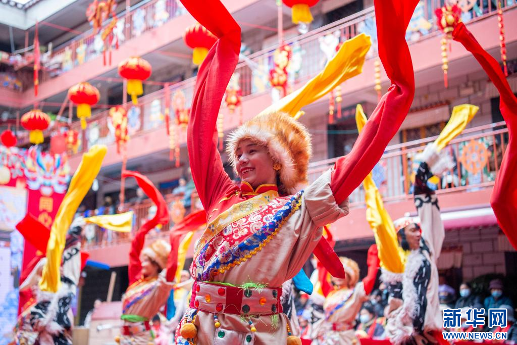 2月23日,拉薩市城關(guān)區(qū)娘熱鄉(xiāng)民間藝術(shù)團(tuán)的演員在德賽大院里表演。新華網(wǎng) 旦增努布 攝
